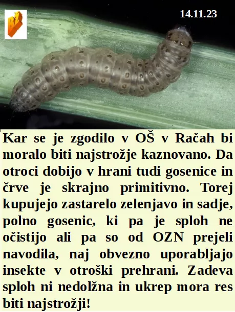In črvi so očitno del redne prehrane v šoli na Račah. Sem mislila, da pride kakšen resen na obisk. Tudi genocidni zlobnež doživlja vračanje zla. In nekdanji angleški premier gre za ministra v Izrael. Kljub vsemu presenečenje, ampak Turčija je vložila kazensko zoper Netanjahuja.