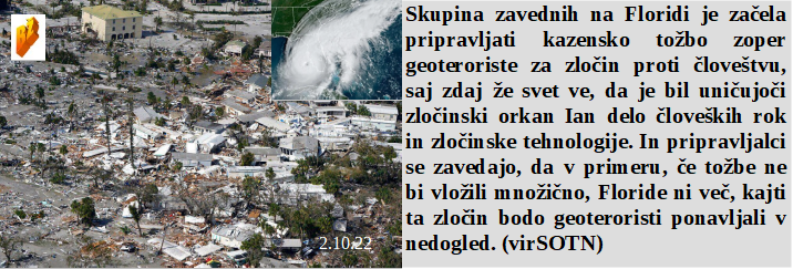 Se ženske zavedate, kako rakotvorni na dojkah so pametni telefoni? Šef Pfizerja kljub vabilu ni prišel na zasedanje EU, ker pač nima jajc resnice povedati. Letos bo naštudirana mrzla zima in tudi vi morate naštudirati rešitve. In ljudje s Floride že pripravljajo tožbo zoper geoteroriste zaradi umetnega orkana.