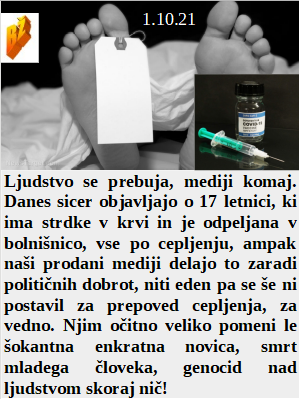 Hodite na proteste so letalski izpusti takrat najpogostejši. Vedo zakaj! Objavili so težave cepljene mladenke, nikoli nič o prepovedi cepiv za vedno. Imajo upokojenci brezplačen mestni prevoz, seveda, če so smrtonosno cepljeni. Cepljenje nikoli ni v vašo korist ampak zgolj tistih, ki vas v to silijo. Biden pa zahteva cepljenje vseh delavcev, saj rabi mijiarde.