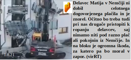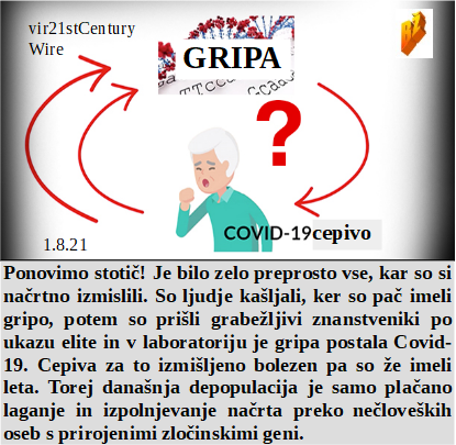 Delavec ni dobil plače, leteli so deli hiše, v katere se je s strojem zaletaval. Gripa že nekaj časa ni več slovenski naziv za bolezen, ki je spremenila črke v covid. Za 6 ur v kolono in na cepljenje, hura. Iz bogatega medija idiot pove, da bi vsem pametnim, ki se nočejo cepiti, morali prepovedati vstop v živilske trgovine. Obstajajo pa tudi zdravniki, ki povedo, da je covid umetno narejen za zločine!