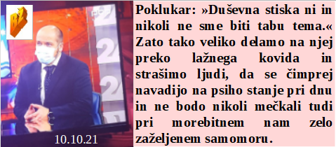 Pri nas ne manjka psihiatrov, le političnih psihopatov je redno preveč na zdravljenju. Ne nosi eden maske zaprejo celo šolo. Za duševne stiske smo izumili kovid! Je Vatikan odločno za cepljenje. Je Hojs pozabil, da je že davno odstopil. Ko se ne moreš odločiti ali je predsednik po poklicu maneken ali smetar! Ko izgubiš diktaturo postaneš srečen človek!