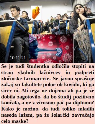 Pravijo, da pri nas za velike denarje laganje sploh ni problem. Ko so žal tudi študentje na strani lažnivih farmacevtskih izmišljenih kovidov. Bolni gredo lahko v trgovino, zdravi komaj še kam. Bo Slovenija darovala Afriki 300 tisoč smrtonosnih cepiv za reševanje lakote. Naravna imunost za strokovnjake ne pomeni nič, šele s smrtonosno injekcijo jo dobite, za nekaj dni!