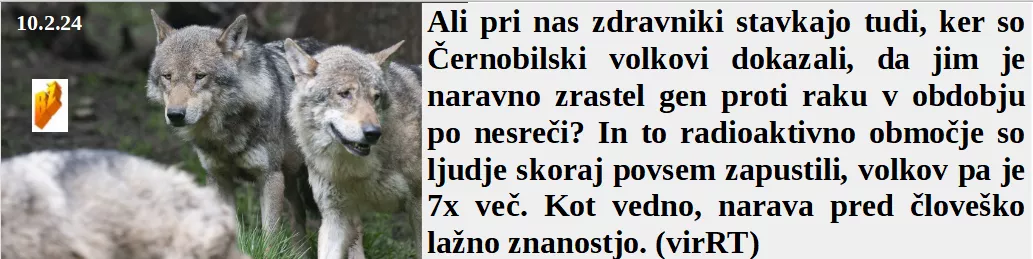 Vam povem, da kupujte vedno zeleno, vse zgori. Razlika med kurenti in parlamentarci je nošenje mask. Je položila cvetje na svoje morilske prednike. Je po Černobilu nesreča pomagala celo volkovom. Če hočemo dobiti vojno z Rusijo delajte več orožja.