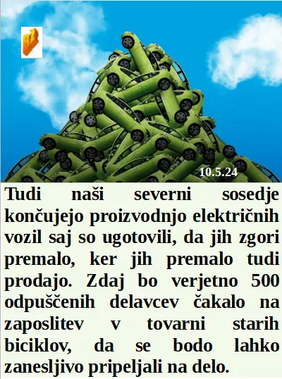 Tudi severnim sosedom je ljubše uničevati električna vozila. Če hočejo na politično pot rabijo zaporniki veliko denarja. Povišanje direktorju enako kot skupaj vsem delavcem. Šefica Italijanskih desnih ne dovoli zavračanja Rimskega pozdrava!