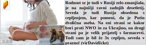 Tudi Rusija množično cepi zato ni čudno, da tudi pri njih rodnost zelo pada. Ste že vstopili v Hišo strahov ali državni zbor? So volitve že urejene in zato lahko vse naivne sprehajalce dobro poškropimo. Je krava rodila trojčke, se verjetnoi ni pustila cepiti!