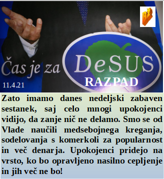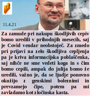 Zelo pomemben bi bil razpad stranke, ki ji za upokojence sploh ni mar. Smo v času zaprtja države vnesli še več strahu in zelo škodljivih igel. In v Nemčiji nasprotnike cepljenja čaka zapor, kajti diktature ne sme nihče oigrožati. Že več kot 100 let je znano za obdobje smrtonosnega cepljenja, pa množice veselo čvekajo o njihovih politikih. Cepiva lahko zamujajo, a jih vedno z nečim nadomestimo, ko pa pridejo so krste pripravljene!