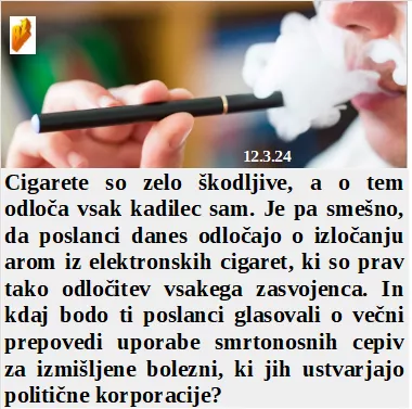 Je človek malce presenečen, da vremenarji ne poznajo strojev za ustvarjanje vremena. Ne o zelo škodljivih cigaretah, samo o aromi elektronskih. Nova koda za EU zdravnike, če niste cepljeni. Bodo stranke družno preimenovale Krško v Fukušima?