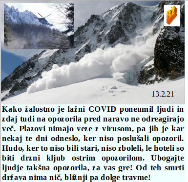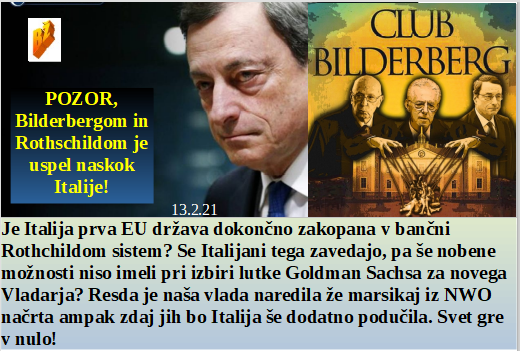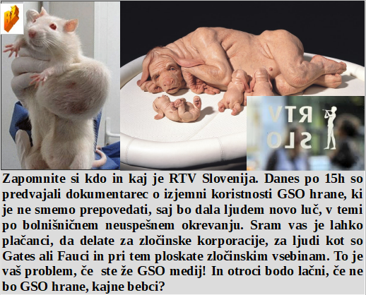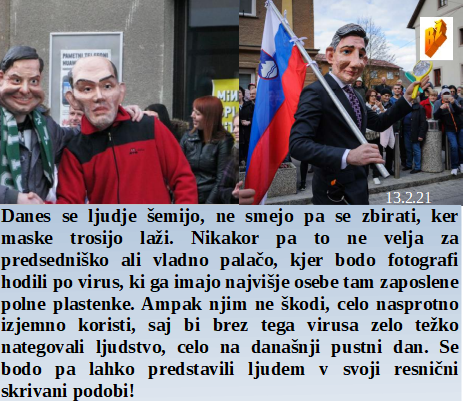 Pust ni dan skrivanja elite, lahko delajo kar hočejo in kjerkoli!. Svetovni vladarji ali bankirji pa urejajo Italijo na najhujši način. Reklamirati GSO in pri tem upravljati javni TV medij je pot v propad. Globalno segrevalno laganje, kar na Kredarici? Plazovi ubijajo pa nimajo nič z virusom, pazite sneg v gorah, to je narava, čeprav jo človek velikokrat zlorablja zase.
