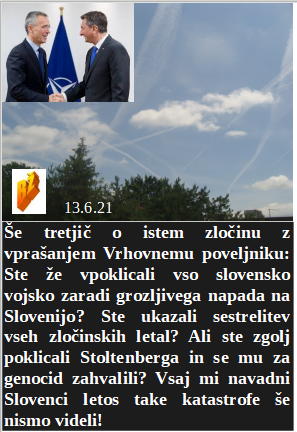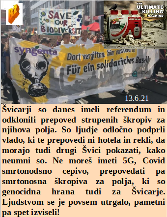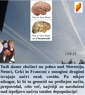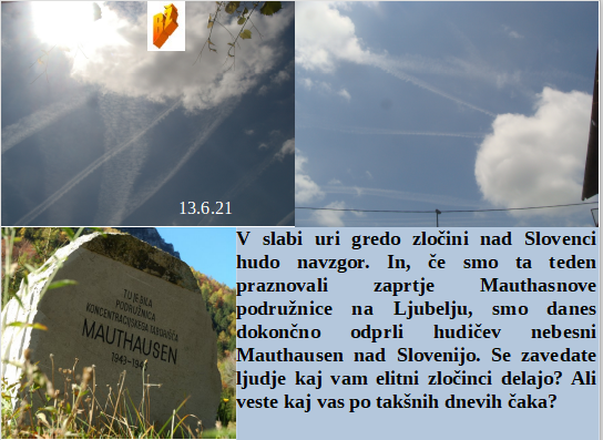 Slovenska vlada vam ploska za prelepo ustvarjeno skoraj modro nebo. BoBo dežela cepi kot nora, da lahko zbolevajo ovce za drugo izmišljeno Indijsko verzijo Covida. Za volitve moramo biti zgolj dolgoletni strokovnjaki, da ni pomote z nepoštenim pregledom volilnih listov. Če hočemo rešiti revščino se moramo vsi cepiti in prepustiti svet peščici elite. Smo v Sloveniji že zgradili Mauthausen po celem nebu. Brez pomote, nista se srečala zaradi sestrelitve morilskih letal. Švicarji so na referendumu potrdili uporabo smrtonosnih škropiv na poljih!