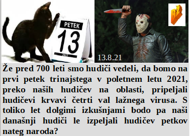 Petek 13-tega v letu 2021 pa že 700 let vemo, da nas čaka 4. val. Cepljenje ali letalski izpusti, kaj je bolj zdravo? Zakaj pa Slovenija še nima velike Haarp postaje, pa jo politika tako nujno rabi? Toliko lažnih informacij okoli nas, zato ni čudno, da ne moremo več misliti. Ko po 51 letih najdeš sliko sošolcev iz zadnjega letnika.
