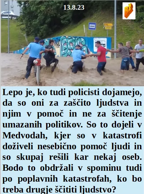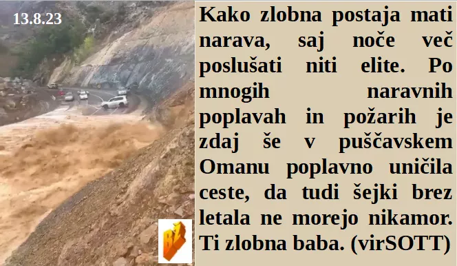 Imamo po poplavah podrte mostove in se celo 30 let razdrto prijateljstvo med ljudmi vzpostavlja. Kako je vse umetno, celo v puščavskem Omanu poplave. Vsaj neki dogodki odprejo oči tudi policajem. Ker so krave povzročiteljice podnebnih sprememb jih nekatere države kar s 5G pobijejo!