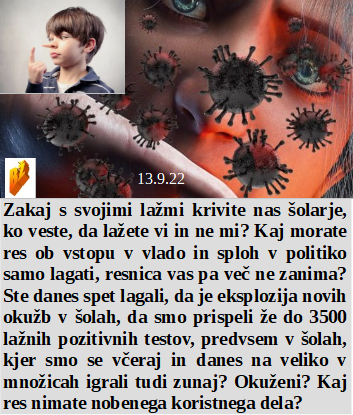 Globoka država obvlada lutkovno gledališče, katerega oboževalci so narod. Bili smo z vami do vseh novih in novih lažnih cepiv. Morate res nas šolarje poneumljati in nam lagati z lažnimi testi? Kaj je lepšega od skupnega uspeha dveh polov strank, zasebne bolnišnice so pa kona!