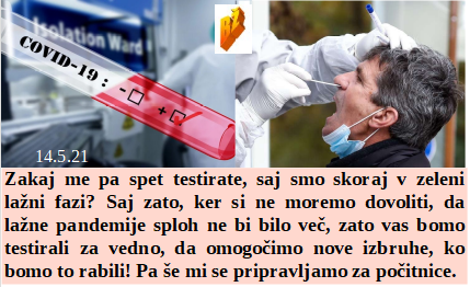 Zakaj ne poslušate farmacevtov in jim ne nosite milijonov? Zdaj vas čaka pa še policijski nadzor doma, ko boste v karanteni zaradi laži. Testi so nujni, če hočemo ohraniti laž. Jaz sem tvoj notorični sledilec. Bomo vse pobrali ljudem, saj oni nič ne rabijo za životarjenje.