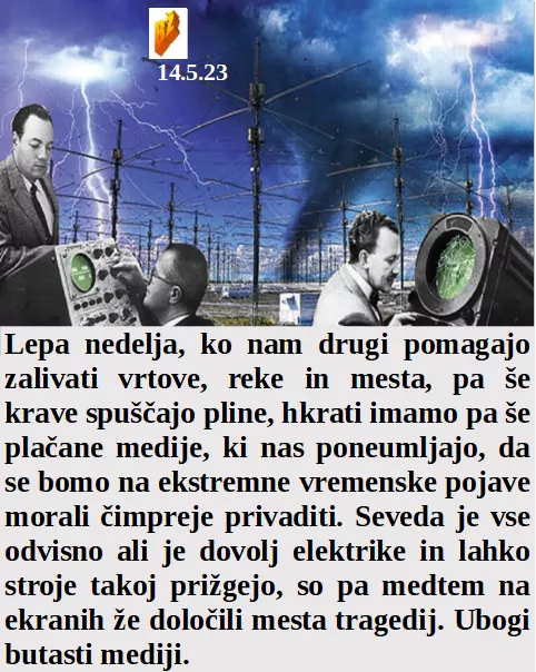 Nas mediji poučujejo kako se bomo morali čimpreje navaditi na sodobne elektronsko vremenske pojave. So Američani odobrili zelo strupeno škropivo, da še kruh ne bo več užiten. Smo lahko ponosni na 30. letnico članstva v SE, saj bomo le tako lahko v 100 letih premagali Ruse.