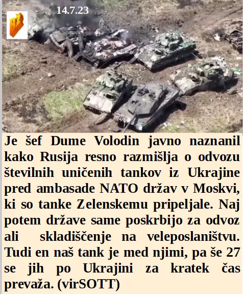 So Rusi tik pred tem, da odpeljejo vsa poškodovana NATO bojna vozila v Moskvo pred ambasade držav, ki so jih pripeljale v Ukrajino. Vremensko ugodne naprave za proizvodnjo elektrike delajo odlično. Upokojenci živijo pod pragom revščine, torej bodo zlahka plačali nov davek. Po temeljitem obvestilu vseh visokih uslužbencev po 11 dneh niso našli kokaina. Ker ni več neurja je treba le še za vodo skrbeti!
