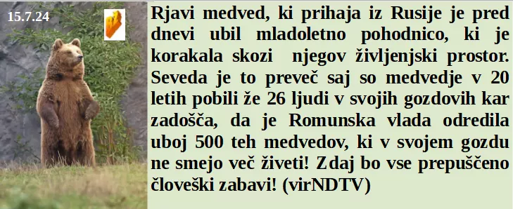 So strele v Avstriji uničile 5000 hektarov kmetijskih zemljišč. Sem sicer hotel Putina pa so ga zgrešili. Od genocida Izraela v Gazi razpada tudi njihovo gospodarstvo. In v Franciji je TV kaznovana, če gost pove resnico. Pohodnica ni opozorila medveda in zato drago plačala.