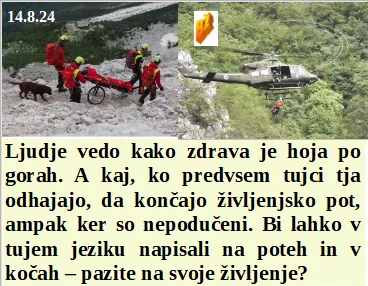 Hoja po gorah je zdrava, a je treba tja s pametjo. Izstrelili 30 raket na Izrael brez posledic. Šolarji si očitno plače med počitnicami ne zaslužijo. Amerika bo vedno potrdila svojo ljubezen do Izraela. So se v Afriki združile koze in opice v kdo ve kaj!