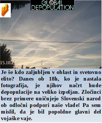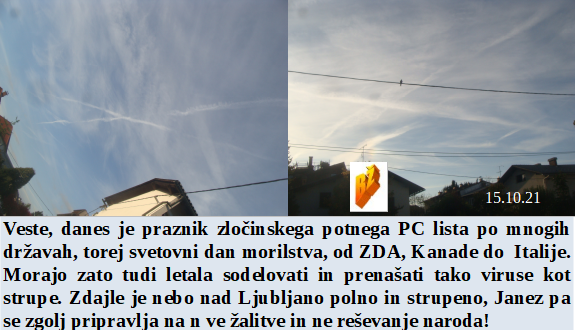 Svet je v rokah elitnih zločincev za katere je barvanje neba hudičeva igrica. Potrdilo PTC moraš dobiti šele 14 dni po cepljenju, saj je velika možnost, da prej umreš. Dve novi javni hiši kupuje naša vlada v Bruslju. Kakšno globalno segrevanje, na Antarktiki pa 50 letni negatvini rekord - -78C. Šefica zdravja v Avstraliji obljublja igle vsem! Ob dnevu potnega PC lista se pa spodobi morilska zračna vaja!