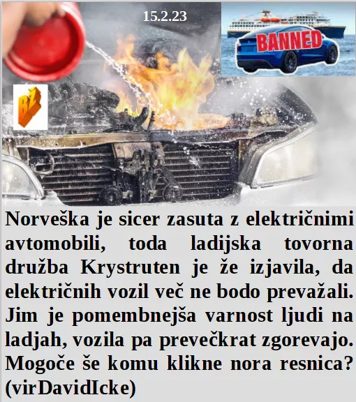Norveški ladijski prevoznik je že rekel, da ustavlja prevoz električnih avtomobilov, ker nočejo, da jim potniki gorijo! Bomo zdaj čevapčiče jedli z malce mletega govejega in veliko žuželčnega mesa. Ukrajinska svastika je moj simbol, saj sem vendar šefica leve stranke. Kako umazana politična spletka, srca ne moreš dobiti, ker nisi cepljena!