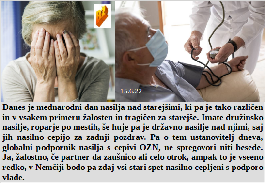 Dan ostarelih, nad katerimi se širi nasilje, tako v domačih krogih kot iz državnih organov. Meso je postalo globalno sredstvo za širjenje ogabnih laži! Kranjski župan pa je sklenil digitalno uničiti Kranj in Kranjčane. Ker v Nemčiji še niso dosegli katastrofalnega možganskega uničenja na novo uvajajo pandemijo in posledično cepljenje!