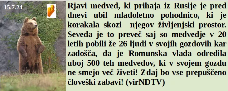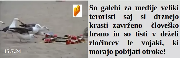 Kako uničujočo točo je letos človek naredil. Galebi teroristi, vojaki dobrodelna bitja. Angleži vračajo Jemenu, ker je ta napadel London. Če ostaneš brez novic pa pripelješ Trumpa. Izdaja domovine! Je stopila v medvedovo hišo, ta pa je nasilje uničil.