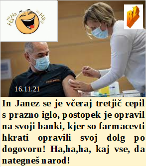 Prazna igla je prekrasen razlog za fotografe in medije. In miselnost zločinske svetovne elite je že tu - imeli boste nič in boste zelo srečni. Loredana odpustili, ker svojim uslužbencem ni dovolil delati v praznih kovid sobah. Vem, da sem v zelo umazanih vodah, a kaj, ko lahko pijem kolikor hočem. Elektrotehniki se spoznajo celo na farmacevtsko dejavnost. Bodo gasilci čuvali vhode na Pošto pred PCT? Pa se še enkrat nasmejte, ko gre pred kamere tudi maneken.
