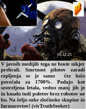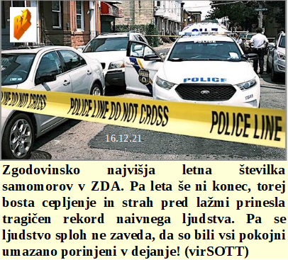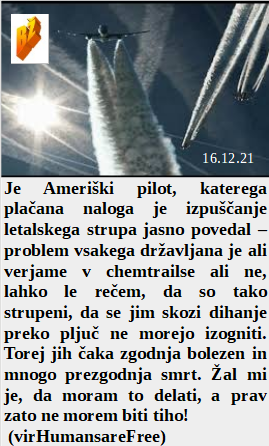 Je celo pilot priznal kako strupeni so izpusti iz letal in se jim skozi dihanje ne morete izogniti. In podtaknjeni kovid je skozi lažne ukrepe in strah že pripeljal do rekordnega števila samomorov v ZDA. So celo starši, ki so nadušeni nad cepljenjem njihovih malčkov. Je Novozelandska iztirjena šefica podpisala odlok, da je v kovid času dovoljenjih največ 25 oseb na seksualnih orgijah. Zaradi cepljenj pilotov se je nihova smrtnost povečala za 1700%!
