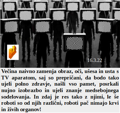 Si ljudje nataknejo TV aparat na glavo in mislijo, da bodo osvojili vse znanje in zdravje, da ne govorimo o resnici. O prijatelj moj vojni, midva se bova pa enkrat veliko lahko pogovarjala o vojnih nategih. In tehnologija danes naredi čudeže - iz LAŽ dobiš v glasovalni škatli RESNICA. Bosta poletela golob in boksar, da pade več krvi po cepljenju.