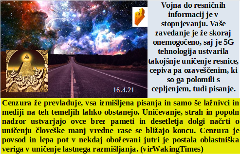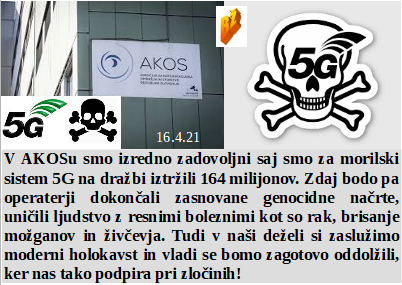Kako hudo navdušeni smo nad milijoni za prodane 5G zločinske sisteme. Tudi mi se borimo za oblast in tudi mi s cepljenjem proti narodu. Strah in cenzura sta pri nas in po svetu že skoraj na polno, saj le tako lahko uničijo narode do konca. Verniki pa morate verjeti v En svetovni sistem, kjer bo tudi vaš šef pri vrhu in služil zasebne milijarde.