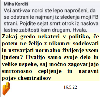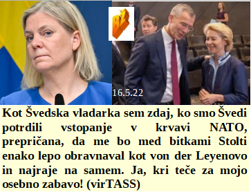 Zakaj se je jezite nad toliko ministri, saj je bilo vendar vse temeljito posvetovano s Sorošem pred odločitvijo! Tisti, ki bi radi bili zdravi in se ne cepili, pazite na lažne ljudske skrbnike. Kdo ve ali bo imel dovolj časa Stolti, da opravi večerno NATO delo tudi s Švedinjo? Kovida skoraj ni več, zaradi cepljenj pa še vedno zelo veliko mrtvih!
