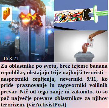 Danes so teroristi povsem drugačni kot nekoč. Oblastniki, ki se norčujejo iz naroda pa so tudi klovni in kopije. Kdo ve od kod ji dostava virusa? Bo NATO šlitil proizvajalce rožic, pa naši tudi? In čistilna akcija po ukazu na javni TV se je začela. Modreci pravijo, da drugi nič ne dobijo, če prvi ne uspejo.