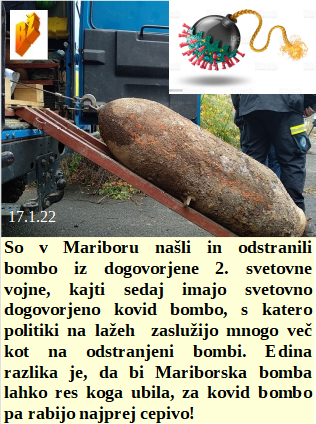 So našli v Mariboru veliko bombo, zdaj bodo o kovid bombi nekaj časa lahko govorili le kot o podobni najdeni. Kakšen hud naraven pojav nas že eno leto nadletava, mrtvi zaradi cepljenja. In dogovorjeno NWO zmanjševanje hrane ljudem so zdaj podprli tudi Kitajci!