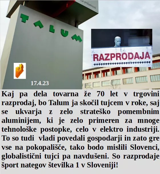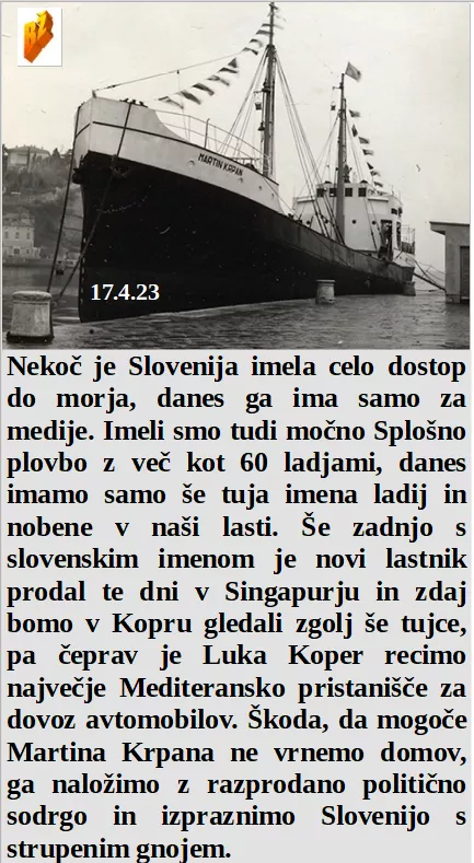 Danes ima Slovenija dostop do morja samo za tujce in nekoč svoje ladje za tuje gospodarje. Je Talum v skladišču za razprodaje. Gre naša predsednica na lastno kronanje v Združeno Kraljestvo. Smo ovce navajene na izživljanje s strani oblastnikov, naših ali ljudskih.