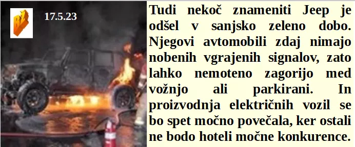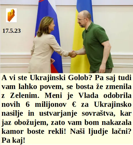 Je naša predsednica preskočila sramoto in povedala, da podpira Putinovo aretacijo. In z denarjem iz korupcije se pri nas pride tudi na oblast. Ponosno teče v Ukrajino, da preda 6 milijonov € Slovencem ukradenih za vojno. Tudi znameniti Jeep je skočil na novo oranžno sijočo tehnologijo.