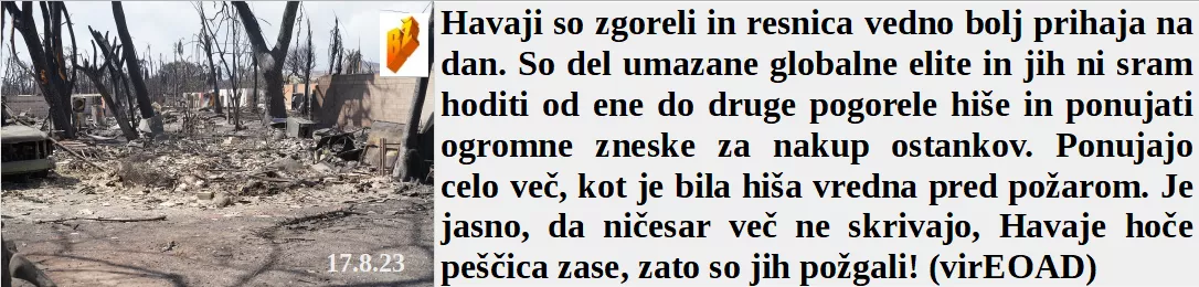 Kako enostavno je danes začeti požare, pritisneš 5G gumb in gori. Mu je Marija rekla hvala, ker si samo na Brezjem prižgal elektriko. In Angleži imajo že pripravljene teroriste za Afriko. Požgane Havaje elita že kupuje.