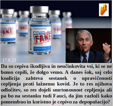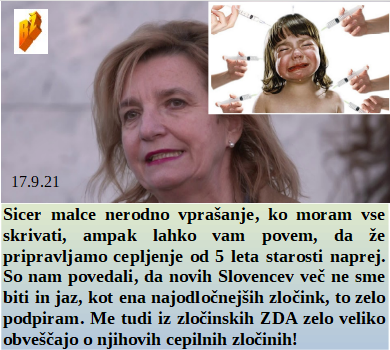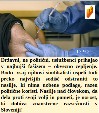 Imate kje pošteno objavljene podatke o mrtvih in poškodovanih po cepljenju v medijih? Ali Koalicija nateguje narod z vprašanjem o upravičenosti cepljenja, ki je že tako jasno smrtonosno! Naša strokovna genocidna skupina za Kovid pa že napoveduje cepljenje od 5 leta naprej! Sem vstavil provokatorje na proteste, da sem imel obilico nasilnih izgovorov. Ena od strokovnih genocidnežev pa že napoveduje tudi cepljenje vseh Slovencev. Zdaj je vprašanje ali bomo ljudje in nekateri sindikati uspeli prepovedati ta fašistični genocid!