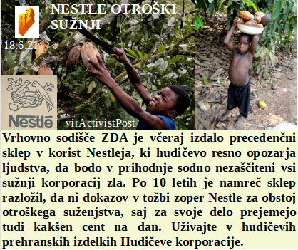 Ena svetovna oblast in ena škatla svetovnih služabnikov. Kdor kupuje Nestle podpira suženjstvo otrok in nezdravo hrano. Zvezdniki morajo podpreti cepilne zločince za svoje nadaljevanje ustvarjanja bogastva. Pobrati ljudem vse, zato pa so vojne. Digitalni covid, da politiki ne pridejo z lažmi v neposreden stik. In treba je vedeti, kateri so starši 960 otrok, ki jih imajo tako radi in so jih dali na cepljenje.