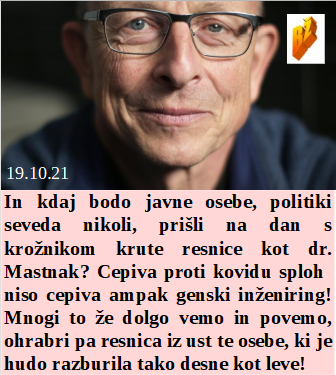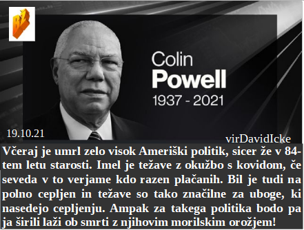 Bodo ljudje pravočasno dojeli kaj se skriva pod imenom in lažjo Kovid? Je možno, da ljudje gledajo toliko manj laži in plačane politične reklame na Dnevniku RTV? Zaradi igel, za katere pa ne veste, je umrl Powell. Koliko časa bodo še naši narodni izdajalci prirejali lažne številke lažno okuženih? In zakaj naše javne politične osebe ne upajo z besedami v javnost kot Mastnak?