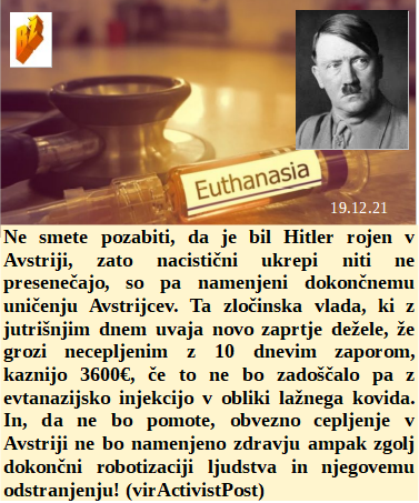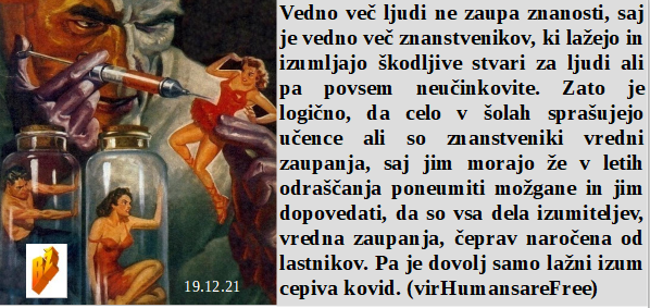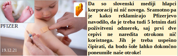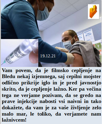 Kako lažje je lagati, ko te cepijo filmsko na Bledu. Je dolgo v grobu ploskal Avstrijec Hitler. Kako naj kdo še zaupa znanosti, ko pa je ta na skoraj vseh področjih namenjena uničenju ljudi? Zahteva Pfizer tretji odmerek za 5 letne otroke, prva dva ne dasta nič. Se najde pomembna oseba, ki pove golo resnico o farmacevtskih morijah. In preko TV dobite drisko, nočni lokali WC pa ves dan z obilico driske!