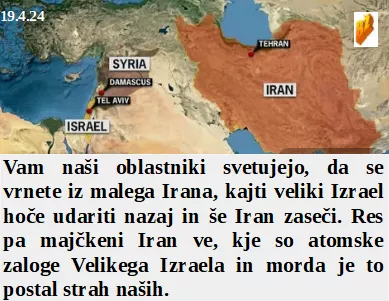 Vam naši gospodje svetujejo, da zbežite iz Irana, ki se ne more boriti proti Sionistom. In uslužbenci satanizma so glasovali proti Palestini. Že 20 let delamo po ukazih in nam ostane le kot dovolijo gospodarji. Orodje v rokah norcev bo vedno zelo nevarno. In ovce bodo delale vse za svojega gospodarja.