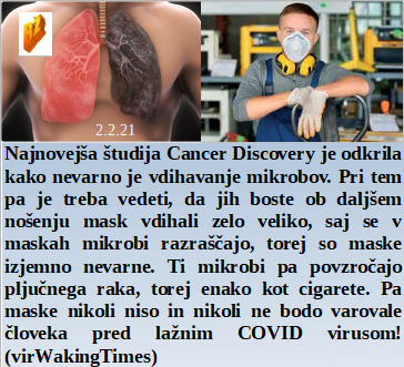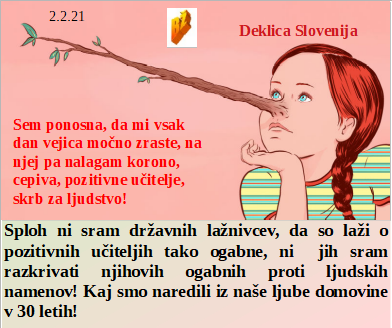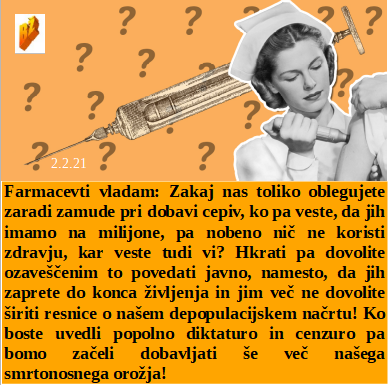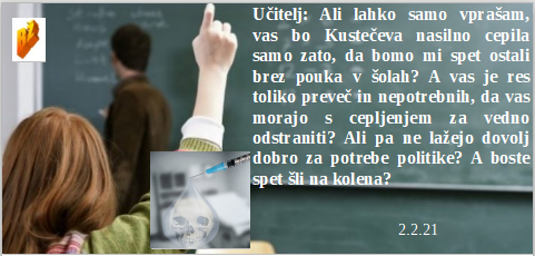Kaj sem naredila, da me tako zlorabljajo za laži in uničevalne namene? Bomo učitelji cepljeni, da bo spet konec pouka? Farmacevti ne moremo dovoliti kritike na naš račun, zato bodo ostala cepiva dobavljena, ko boste vladno potrdili, da so odlična. Ste brezdomec? Potem ste upravičeni do kazni, za katero niste krivi. Ste nehali kaditi ampak nosite masko? Torej ste še bolj zapriseženi pljučnemu raku! Tudi Koper se budi in upajmo, da bo enako storila končno cela Slovenija!