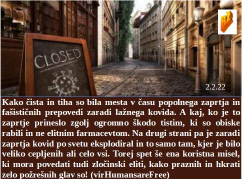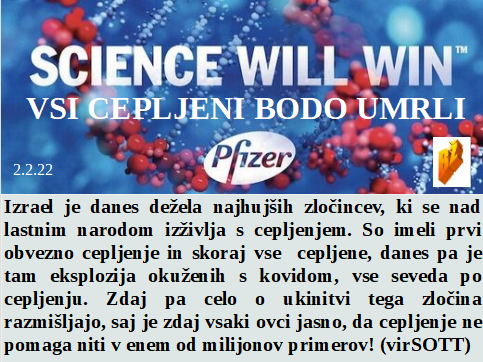 Če bo šlo naprej po 23.000 lažnih testov dnevno smo do 2030 vsi idioti ali mrtvi. Najpomembnejši odločajo o številu okuženih in vrstah kovida. Izrael cepi svoj narod, ker hočejo izjemno razširitev kovida. Želim vsem olimpijcem prijetno cepljenje z morebitnim preživetjem. Največ praznih gostinskih lokalov je, kjer so bili ljudje množično cepljeni. Tudi šolarji končajo šolanje uspešno le, če dovolijo pozitiven izid testiranja.