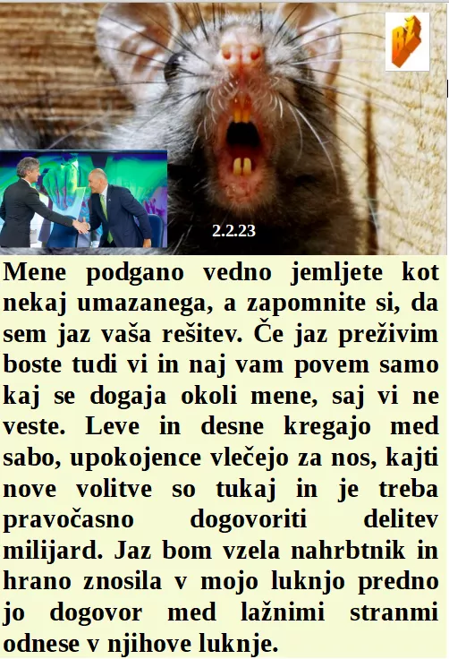 Kako hinavske so današnje Zelene združbe, ki predvsem zagovarjajo postavljanje uničevalnih vetrnih obmorskih elektrarn. Če sem prodala slovensko letalstvo bi pa zdaj lahko imela svojega letalca! Kako prozorno je vpletanje v Ukrajino, se obresti na ECB vsak mesec dvigujejo, za korist peščice. Mene sovražite ampak zapomnite si, samo če jaz podgana preživim boste tudi vi.