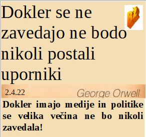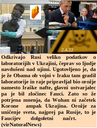 Menda ne bo država skrbela za nas slovenske reveže, ko pa so ukazi od drugje? Tudi mi smo bili pred desetletji naivni in celo gledali Disneya, danes pa vemo kakšna zločinska banda je to! Nekaj centov večje plače in pokojnine smo vam uredili, da boste veliko eurov dražje kupovali tudi hrano. Že Barrack se je aktiviral pred skoraj 10 leti v gradnjo Ukrajinskih laboratorijev. Če ne veš kaj se dogaja ne moreš biti upornik!