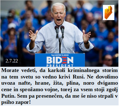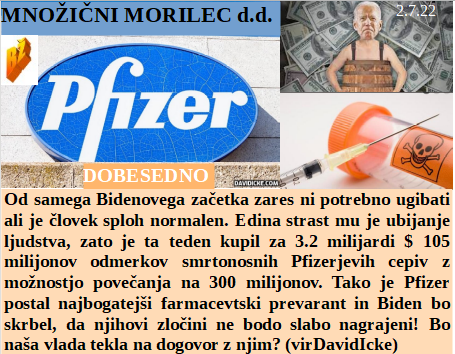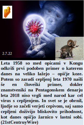 Tudi laganje je za mnoge nekaj prestižnega, zato naši mediji prehitevajo EU. Vnaprej je kupil Biden kar za 3.2 milijarde dolarjev smrtonosnih Pfizerjevih odmerkov. Še nikoli v obstoju zemlje virusi niso poleti bežali iz hladilnikov. Leta 1958 so v Kongu našli prvič nekaj podobnega opičjim kozam. Za vsak zločin, ki ga naredi Biden so krivi Rusi, le v zaporu ga še ni!
