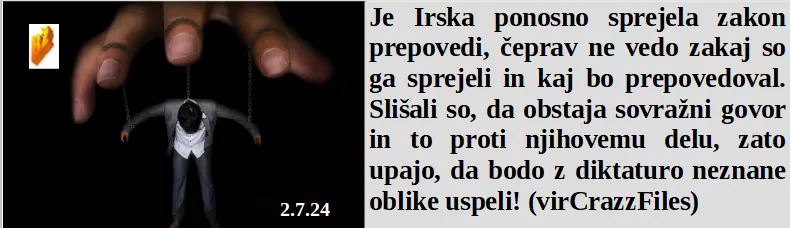 Stavka dogovorjena, morda pridejo minimalne redne plače? Je Irska sprejela prepoved govora svobode. Ga je Soroš naučil političnega hinavstva? Trdno pred ekrani pa nič od tega! Ker je komikov veliko bo komika lahko zamenjati!