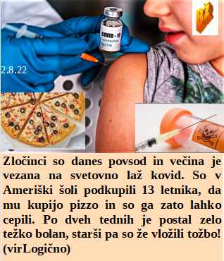 Kot ljubljenček vašega šefa vam bom pomagal, da začnete delo v OZN. Amerika že dolgo nima pameti, zdaj še otrokom dovoli menjati spol. Ameriška šola je učencem ponujala pizzo za smrtno cepljenje. Slovenija je sprejela donacijo od koz za 1400 mrtvih! EU že krade tudi Hrvaško, ta pa se ji je zahvalila z wc papirjem!