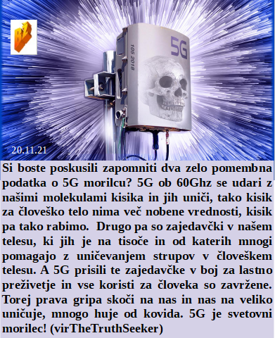 Kakšen hudič se razplamti, ko pri nas županja pove resnico! Ministrice pa veselo čakajo in preživijo interpelacije, čeprav bi v normalnem sistemu že zdavnaj padle. Biden na prestolu ni mrtev, lahko pa je mrtev original. Na vseh področjih človekovega življenja je 5G morilski! Avstrija že po legi ni primerna za smučanje, če pa pade v roke eliti potem pa sploh ne. 50 letnike in starejše je treba s cepljenjem čimprej odstraniti.
