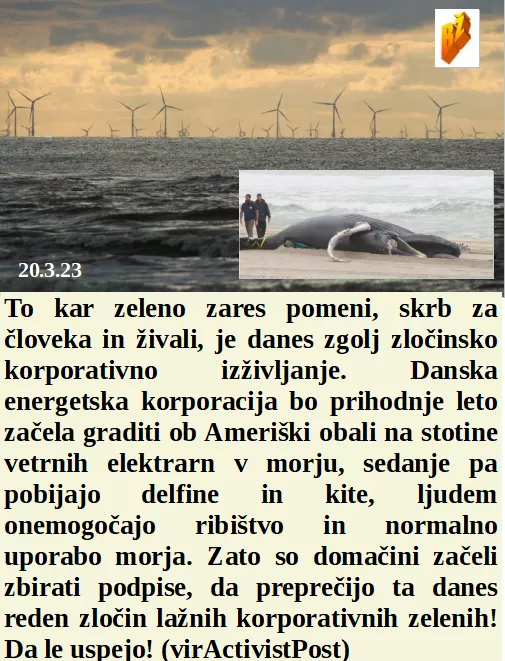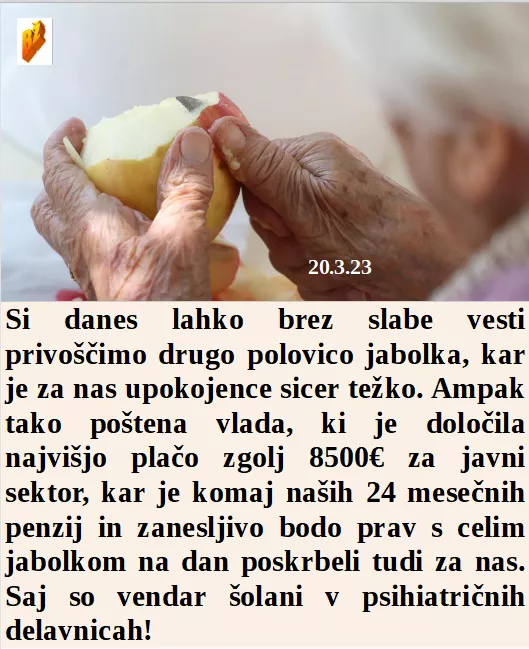 Kar 2/3 je srečnih Slovencev, seveda na vladnih papirjih. Brez vtikanja človeka se danes dan in noč veselita na isti ravni. Zelene morske vetrne elektrarne pobijajo kite in delfine. In še drugo polovico jabolka lahko danes upokojenci pojedo.