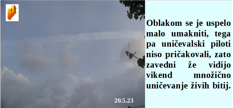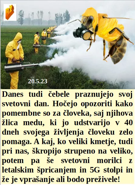 Ker so na današnji dan slavile čebele so na mnogih poljih in v sadovnjakih po njih udarili s polnimi stroji. Osiromašeni uran napolnijo v oblake in jih pošljejo v Evropo. 5G mora za človeštvo, ne bo več skrivanja pred zlobnimi. So pomotoma odstranili oblake in genocidna igra se je razkrila.
